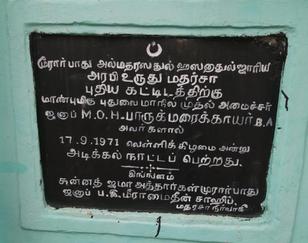 “அதெல்லாம் சரி.. தொடக்கமே குழப்பமாக இருக்கிறதே.. நமது (பெண்கள்) அரபி மதரசாவின் பெயர் மதரசா யே மிஃப்தாஹ் அல் குலூபி பெண்கள் அரபி கல்லூரி என்பதுதானே.. ஆனால், கல்வெட்டில் மூரார்பாது அல்மதரஸதுல் ஹஸனதுல் ஜாரியா அரபி & உருது மதரசா என இருக்கிறதே.. இது என்ன விதமான வரலாறு” என்பவர்களுக்கு.. சற்றே பொருங்கள்..